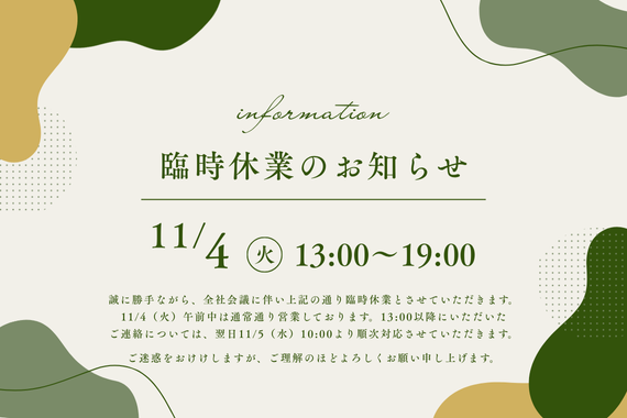 2025年11月4日(火)13:00~19:00は臨時休業とさせていただきます。13:00以降にいただいたお問い合わせは、翌日11月5日(水)10:00より順次対応させていただきます。ご不便をおかけいたしますが、ご理解のほどよろしくお願い申し上げます。